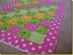 you'll notice some free form machine quilting. The quilting itself is definitely not perfect but what a great learning experience! Most importantly I think I could have saved myself 4 hours of picking out stitches if I had only thought to try it with the presser foot down. The darning foot was a Christmas present from my husband and I couldn't wait to try it out. This quilt was originally intended for a shower gift but wasn't finished in time. I’m sure I’ll find a home for it but I'm kind of stuck on what color to use on the binding. I think white would look best but will get so dirty around the edges. If anyone has a suggestion, please let me know. Otherwise I think it's going to sit on the "needs bound" pile for a good while.